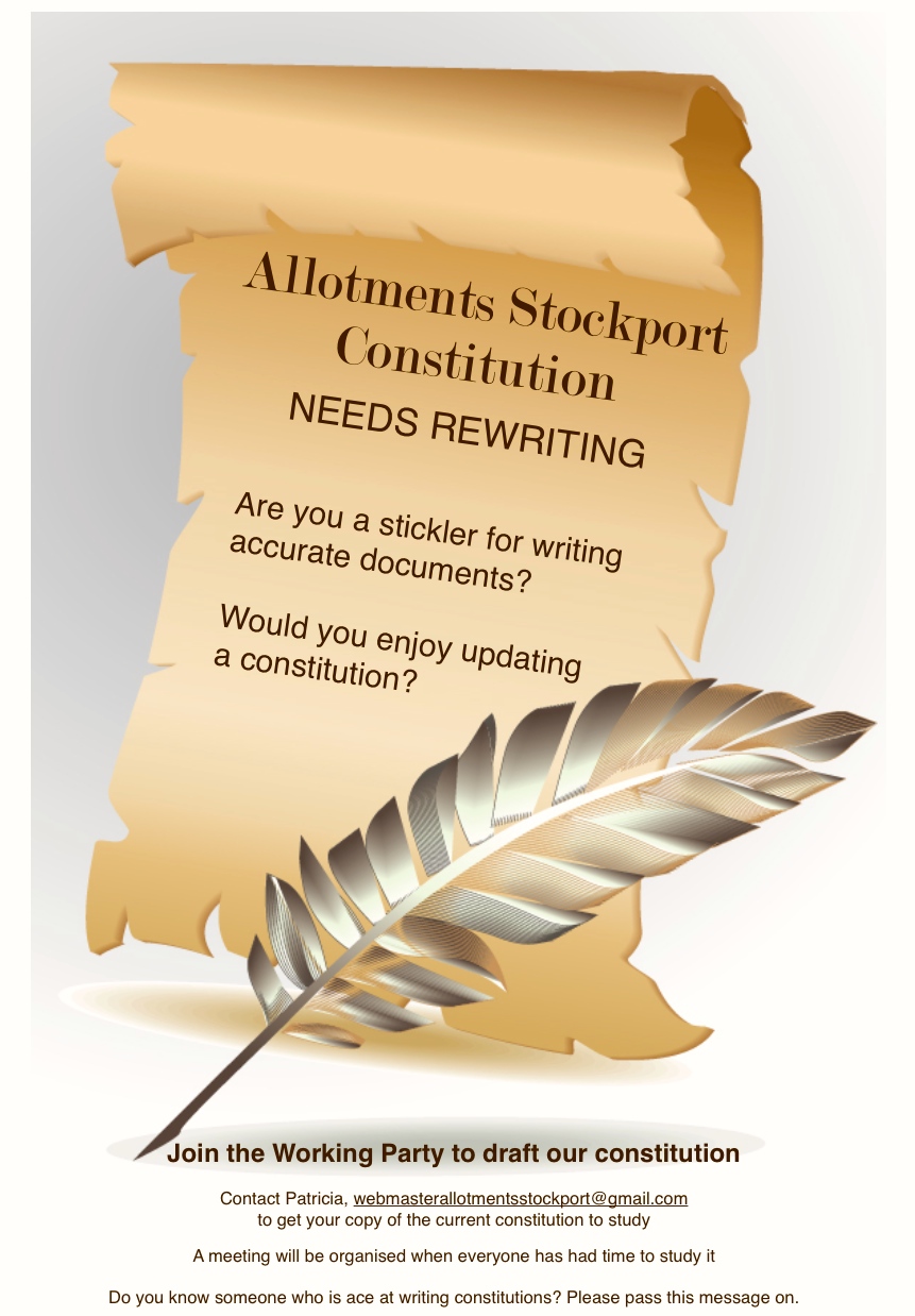 You are invited to the 1st meeting to draft Allotments Stockport Constitution on Monday 3rd November, 4pm at the Magnet Pub.