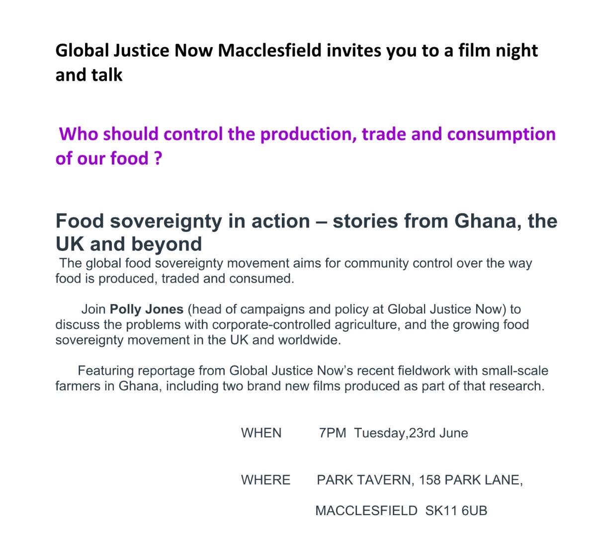 Global Justice Now film on Tuesday 23rd June