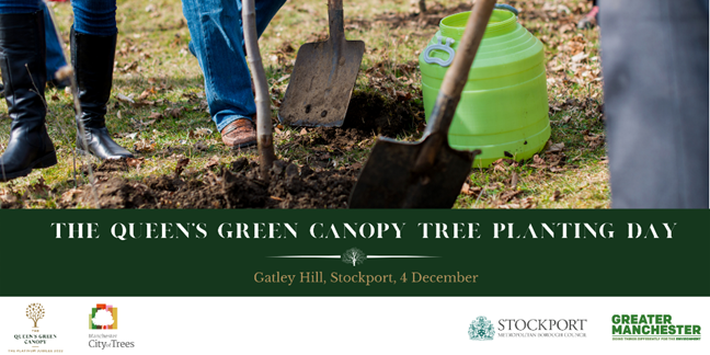 In partnership with The Queen’s Green Canopy Committee, Stockport Metropolitan Borough Council and Greater Manchester Combined Authority, City of Trees invites you for a day of tree planting at Gatley Hill, Stockport to ‘plant a tree for the jubilee’, as part of the Queens Green Canopy.
